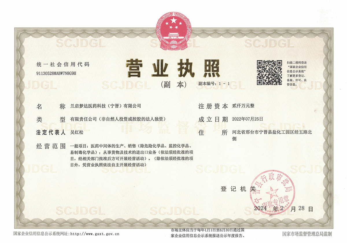 兰启梦达医药科技(宁晋)有限公司 版权所有(C)2024 网络支持 中国化工网 全球化工网 生意宝 网盛建站 著作权声明 冀ICP备2024055150号